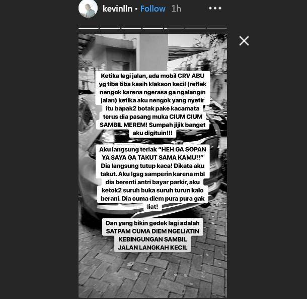 "Sumpah jijik banget aku digituin. Aku langsung teriak, 'Heh nggak sopan ya. Saya nggak takut sama kamu!! Dia langsung tutup kaca," kata Kevin Liliana di Insta Story.