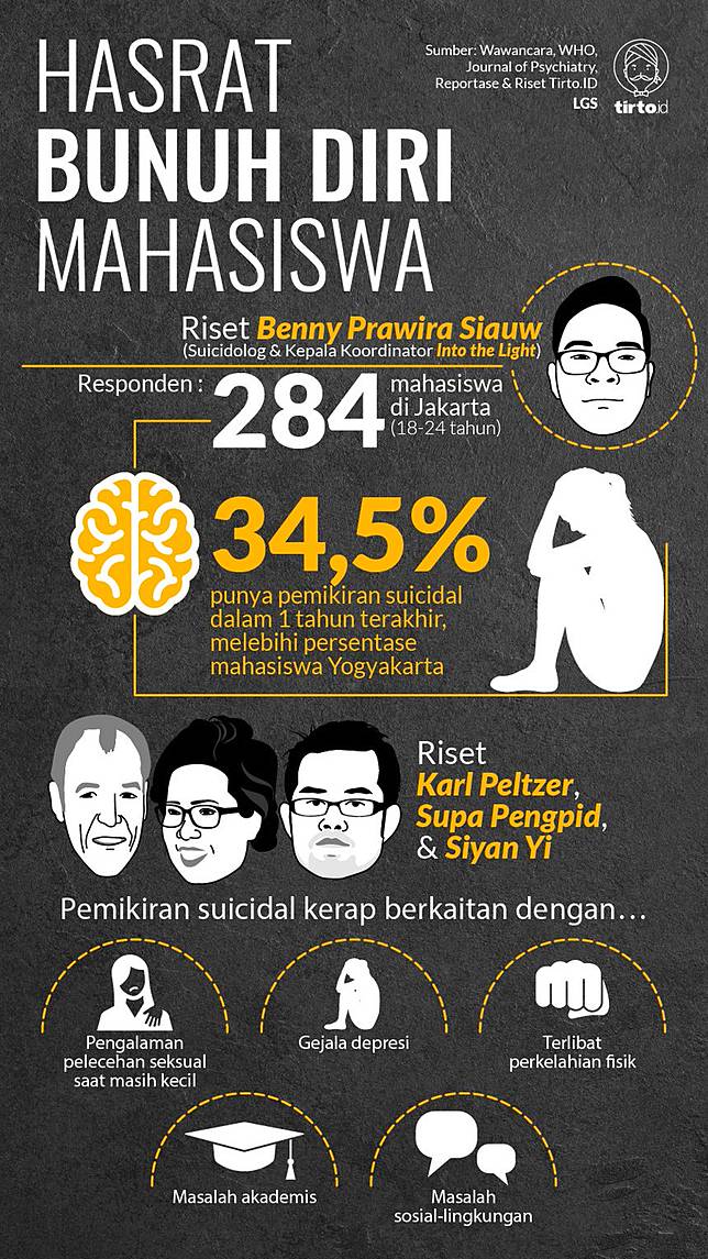 Temuan Benny, dalam riset tesisnya, 34,5 persen mahasiswa Jakarta punya suicidal thought. Ia mengambil 284 responden dari beberapa universitas swasta dan negeri di Jakarta. Hasilnya, 1 dari 3 responden riset Benny punya kecenderungan pemikiran bunuh diri.
