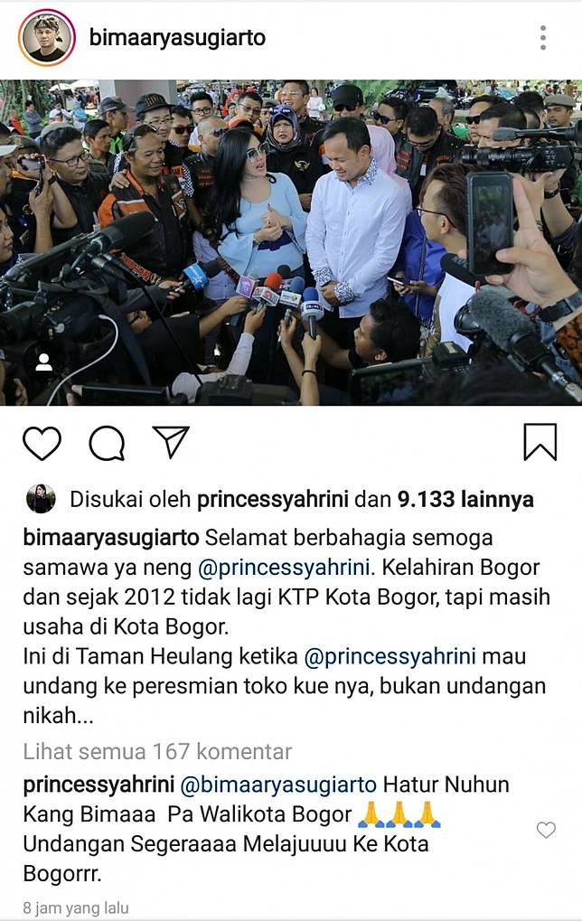 "Selamat berbahagia semoga samawa ya neng @princessyahrini. Kelahiran Bogor dan sejak 2012 tidak lagi KTP Kota Bogor, tapi masih usaha di Kota Bogor. Ini di Taman Heulang ketika @princessyahrini mau undang ke peresmian toko kue nya, bukan undangan nikah," tulis Bima Arya di keterangan fotonya.